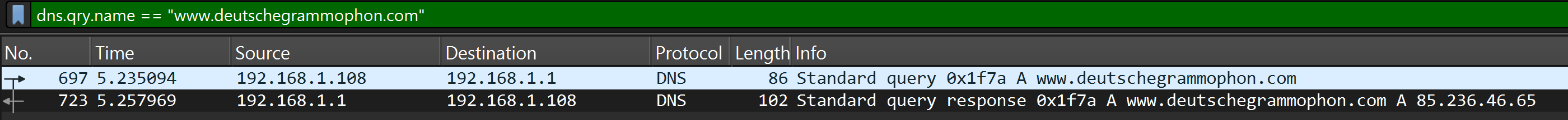 The filter command used is relatively easy to understand. The first thing to note here is the protocol being filtered. Because the filtering is based on DNS queries, this is dns. dns alone would already be a valid filter. However, this would then display all DNS packets . The filter is therefore supplemented to dns.qry.name, where qry is short for query. The addition name stands for the domain name that is being queried. == is the logical operator used for filtering and means ‘is equal to’ in this case. The string being searched for is between the quotation marks. If the page was accessed exactly once during recording, the filter will display two packets: one DNS query and one DNS response. If the page was accessed multiple times during recording, the filter will display multiple packets.