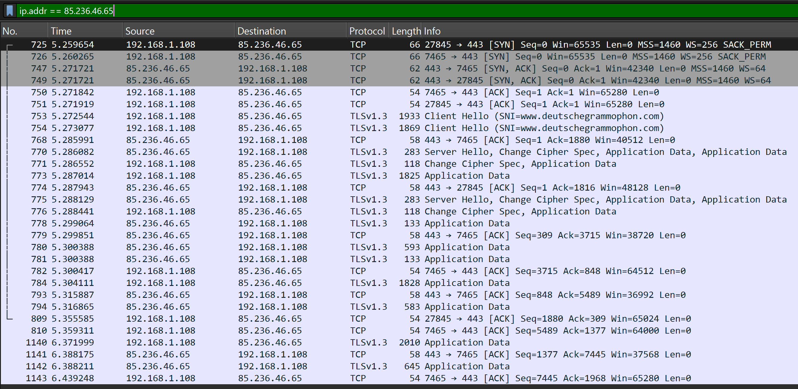 This process can be observed with Wireshark. For this, a combined Wireshark display filter is needed. As an example, the connection establishment between the local computer and the website of www.deutschegrammophon.com is considered. The first part of the filter should only display those packets that communicate with the IP address of the server of www.deutschegrammophon.com (85.236.46.65). This filter is