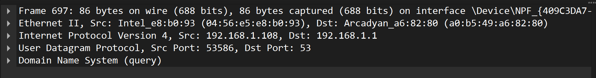 In the summary, the source and destination addresses of the IP packet are displayed. In this case, these are the private IP addresses 192.168.1.108 and 192.168.1.1. 192.168.1.108 is the source address, identifiable by the abbreviation “Src”, and 192.168.1.1 is the destination address, identifiable by the abbreviation “Dst”. Both devices are thus located in the same LAN. The computer with the IP address 192.168.1.1 is the router. This device establishes the Internet connection and can answer DNS queries from its cache.