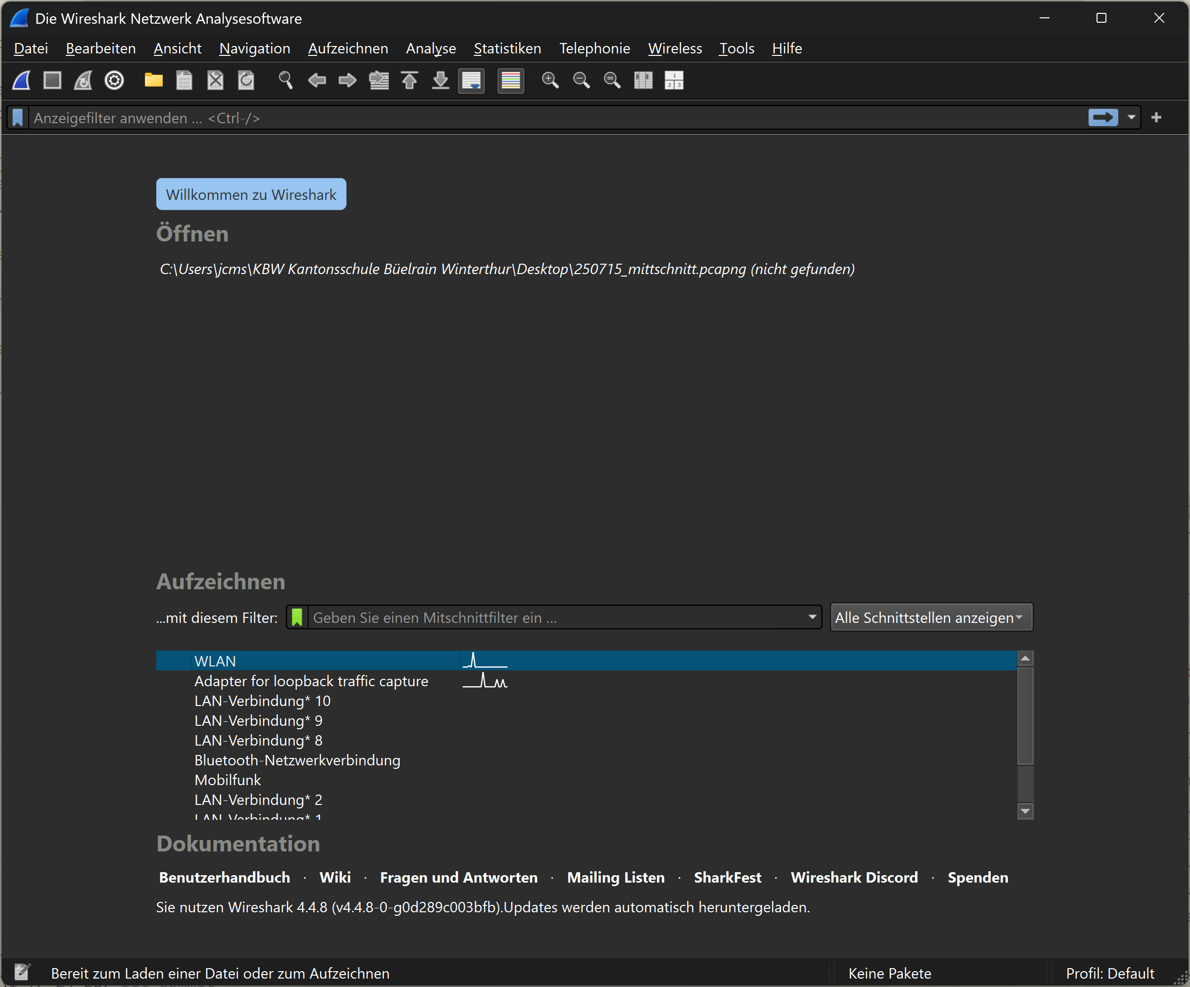 Under the heading ‘Capture’, you can select the desired network adapter and start recording. The captured packets are displayed in real time and can be analysed later. At school, the connection to the Internet is established via WLAN. The WLAN adapter must be selected accordingly. Once the appropriate adapter has been selected, recording can be started. Recording is started by clicking on the blue shark fin icon in the toolbar. Recording starts immediately. Recording is paused by clicking on the red square icon in the toolbar. The recording can be saved either via the File > Save menu, by clicking on the file icon or by using the key combination Ctrl + S.