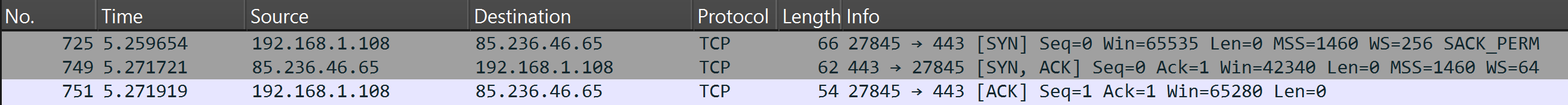 That the packets show the communication sequence of the Three-Way Handshake can be seen from the set flags. In the first step, the client sends a SYN packet, to which the server responds with a SYN-ACK packet. The client confirms this with an ACK packet. These three steps are visible in the Wireshark filter. The respective port numbers used in the TCP packets are clearly recognizable.